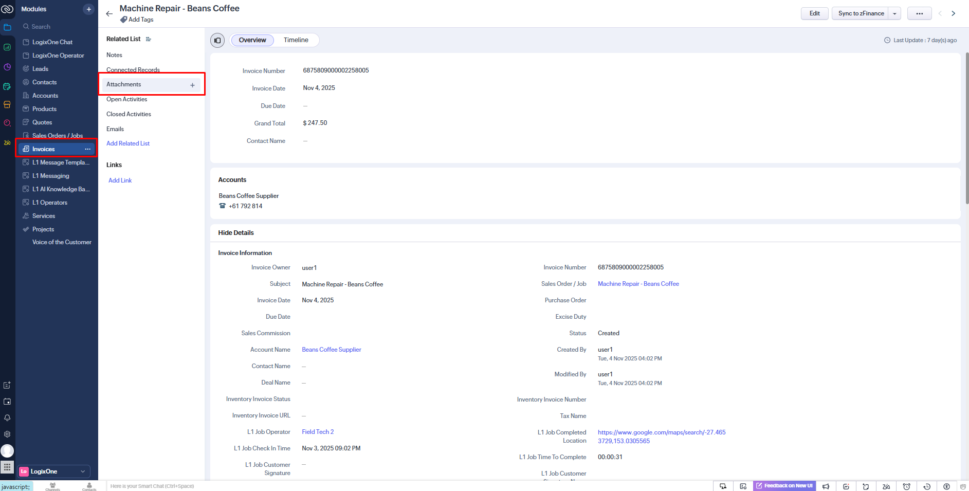 Completed 'Job' attachments are saved in the 'Jobs' corresponding invoice. To access, navigate to the LogixOne Calendar and select the completed 'Job'. Click it and select 'see invoice'. to quickly navigate to the invoice.