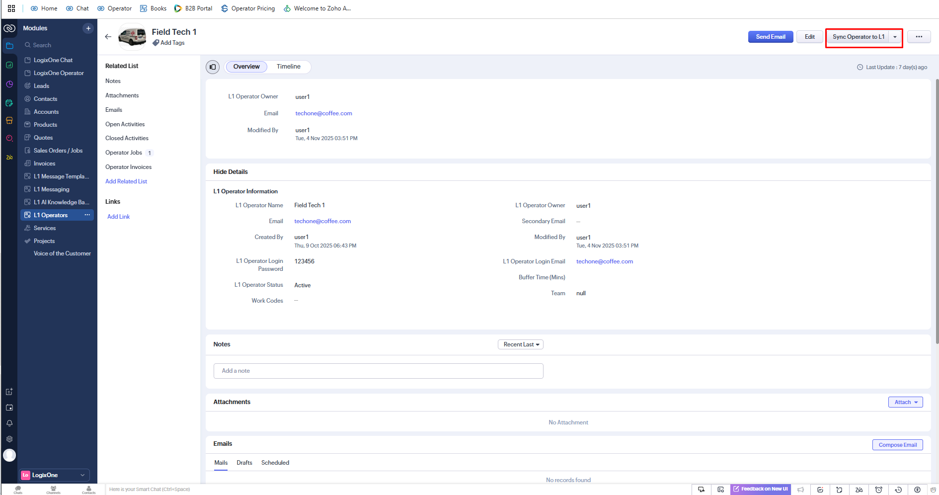 This issue is commonly caused because you have created a ne 'L1 Operator' within the L1 Operators module and the new Operator 'Record' within the CRM has not be 'Synchronised'. After creating an Operator or make any modification to an Operator you must click the 'Sync Operator' Button as detailed below. Or best practice is to create the Operators from within the L1 Operator module and the sync happens automatically.