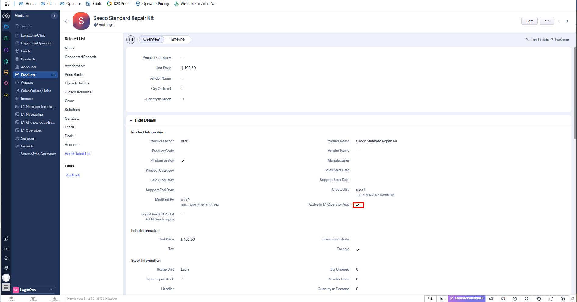 PLEASE NOTE: NOT all Items from the CRM 'Products' module within the 'Add Items' list are synchronised with the L1 Operator App only. To Synchronise a product from the CRM to the 'Add Items' list within the L1 Operator APP requires the 'Product Active in Operator App' field is 'Checked', see below:
